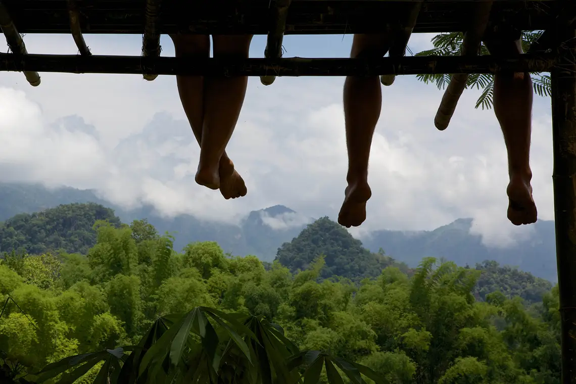 After a lunch break at the riverside Tiger Trail Adventure Camp, complete with a breathtaking 600m towering rock face in the background, we'll cross the river and make a 1.5 hour trek through lush jungle to a mountain village Khmu homestay.