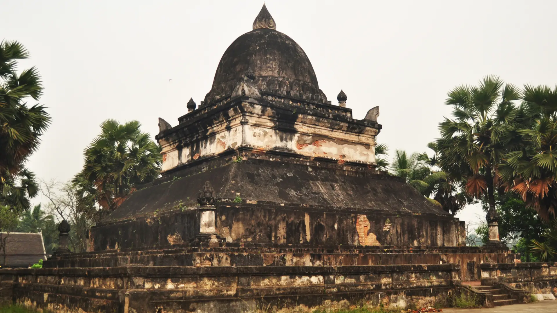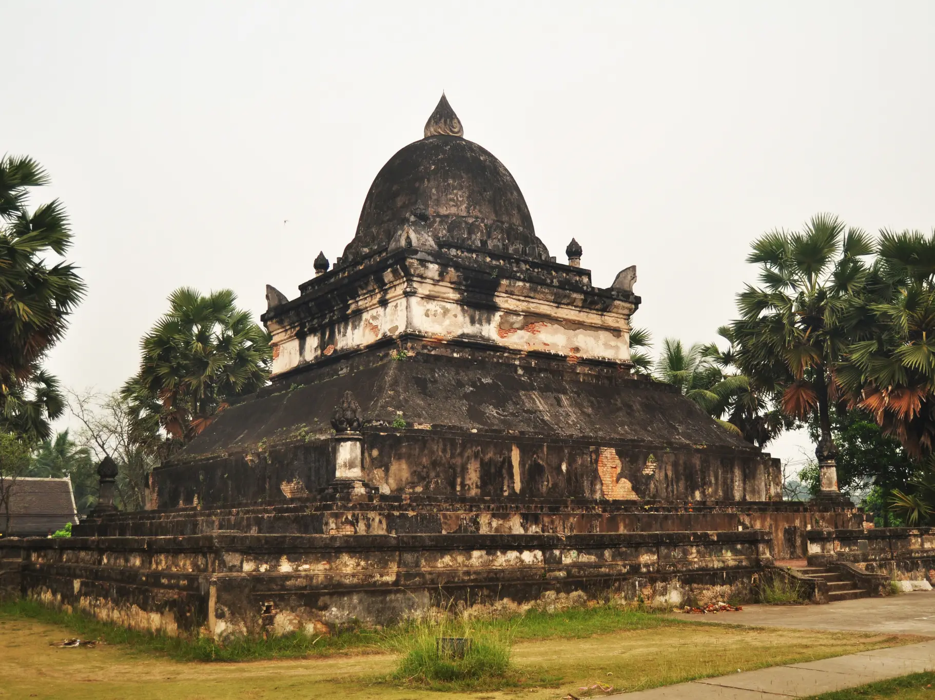 Another important and prominent feature of the wat is its unique That Pathoum, or Stupa of the Great Lotus, in the front and northeastern side of the sim. It is known more popularly as That Makmo, the "Watermelon Stupaï" because of its rounded dome. The dome stylistically reflects a Sinhalese influence and is the only stupa of such a shape in Laos, and perhaps even in Cambodia or Vietnam. Originally erected between 1514 and 1515, it was destroyed during the Haw Black Flag incursion in 1887. Inside were numerous ancient Buddha images. Many were destroyed; a number are in the National Palace Museum, and some are in the sim itself. Its reconstruction was not seriously undertaken until the late 1920s, over thirty years after the reconstruction of the sim, and was completed in 1932. The stupa sets on a number of different square tiers and has a Lao-Buddhist style Usnisa crown at its top.