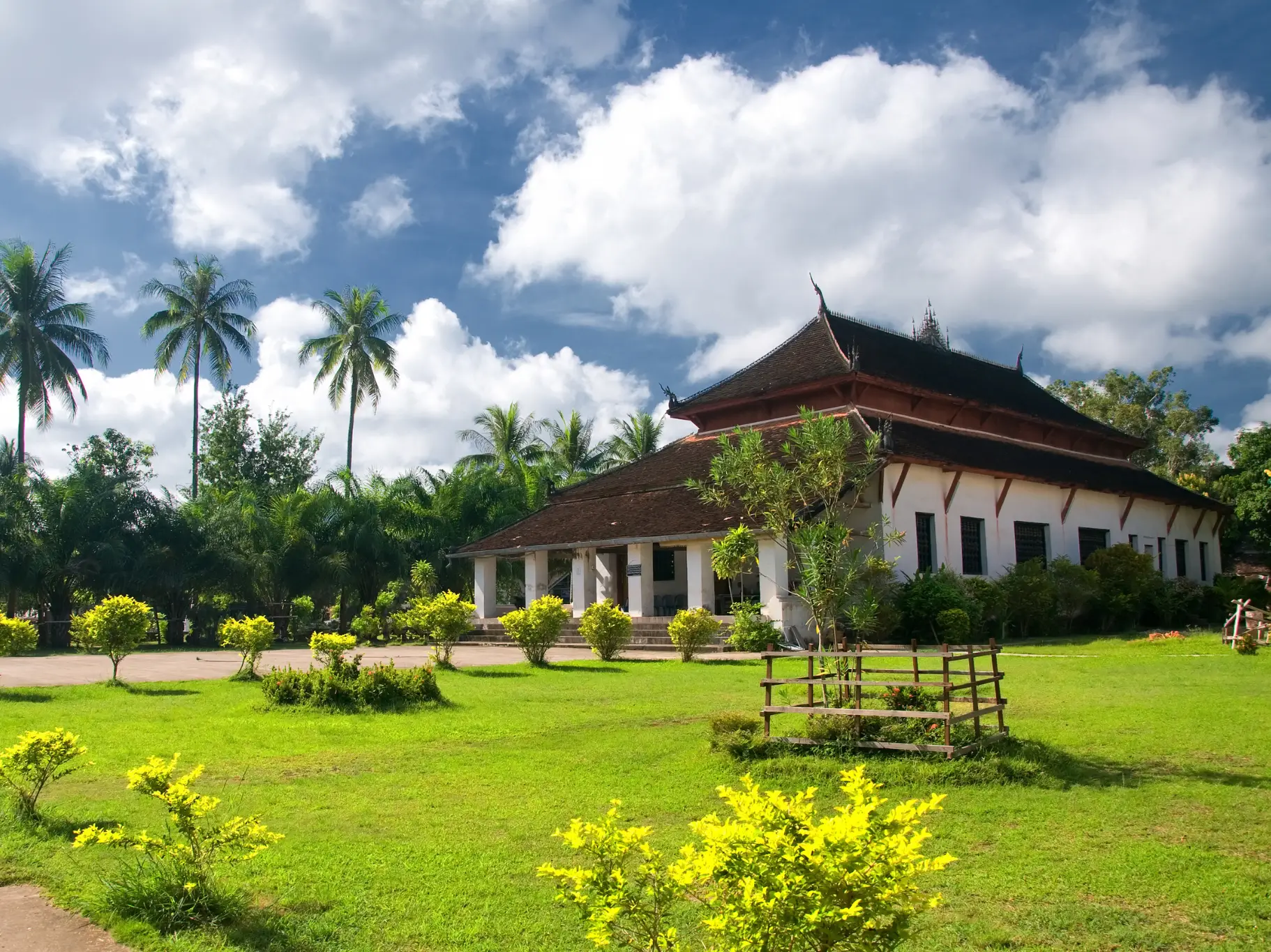 The original highly ornate wooden sim was a spectacular example of Lao craftsmanship at its finest and was one of the most imposing religious structures of old Luang Prabang. It had a double roof with the upper roof raised high above the lower roof. It was over 118 ft. (36m) long and 59 ft. (18m) wide; perhaps 4,000 trees were used in its construction. Each of the twelve pillars supporting the roof was almost 100 ft. (30 meters) high. There were twenty-one windows with turned wooden balustrades. Louis Delaporte’s engraving of its appearance in the 1860s is included in the series of photographs that follow on this site and shows the unique character of the sim. Most of the partitions of the original building were carved wood, and the exterior, as portrayed in the engraving, made it one of the most beautiful in Luang Prabang. It also housed a major collection of rich religious objects and other "objets d’art". Much of the sim and the city were destroyed during the invasion of the Chinese Haw Black Flags marauders in 1887.