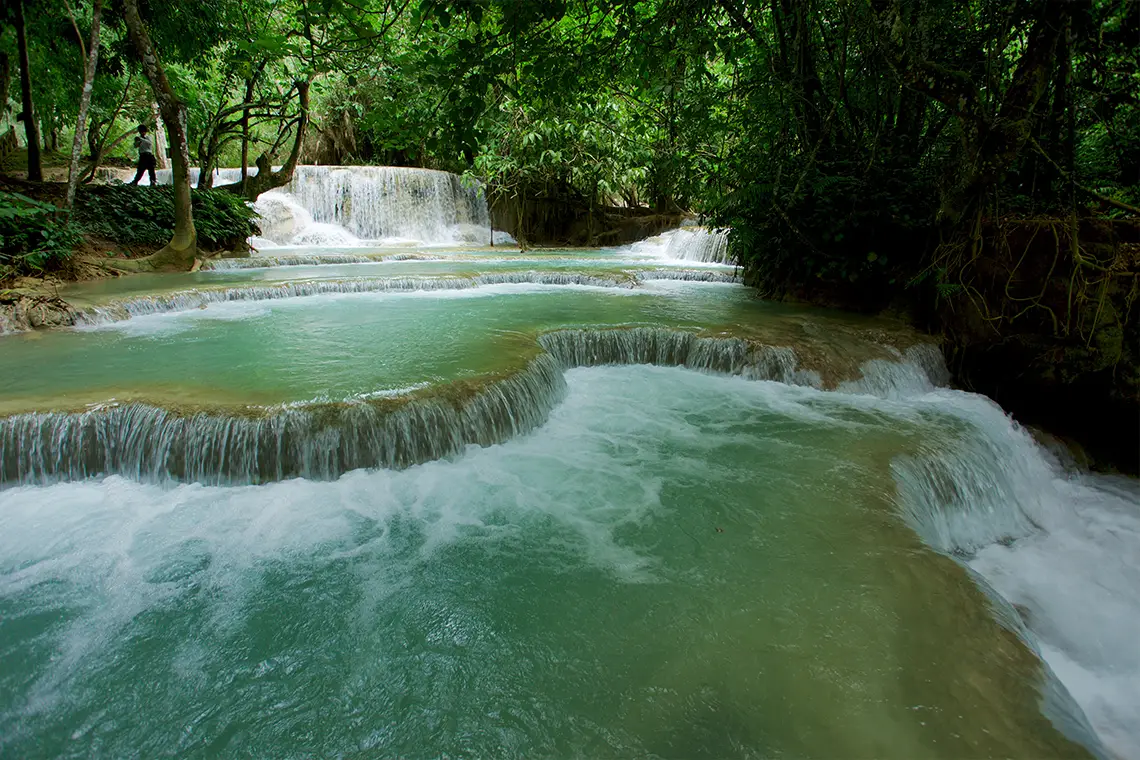 In the afternoon you will arrive at the crystal clear Kuang Si Waterfall. An exciting forest trail leads you to the end of your trek and your reward - the welcoming and refreshing pools of Kuang Si Waterfall where we will have plenty of time to relax and swim.